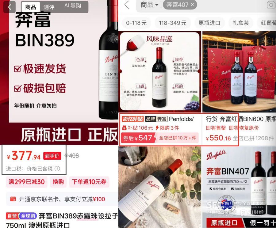由于奔富BIN系列是全球不同市场采取配额制,各地定价不同,市面上有很多其他国家的BIN系列产品通过非官方渠道流入中国市场,被称为平行货。