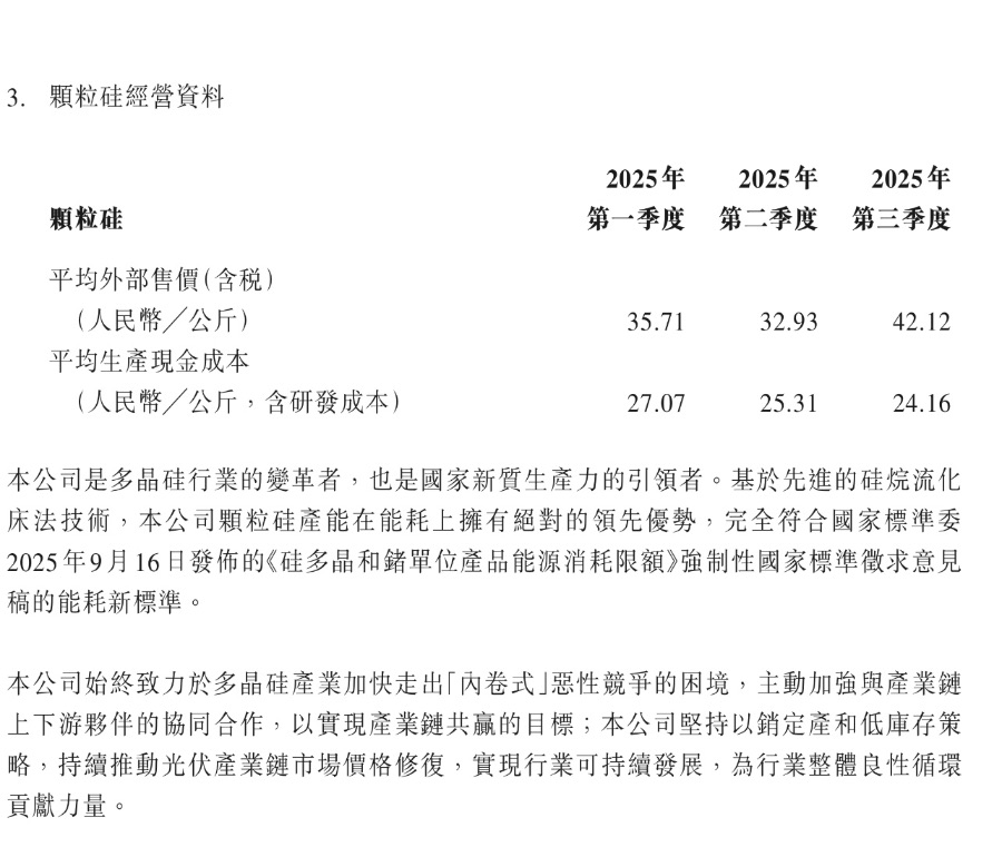 与此同时,其颗粒硅平均外部含税售价为42.12元/公斤,较第二季度的32.93元/公斤显著上升。