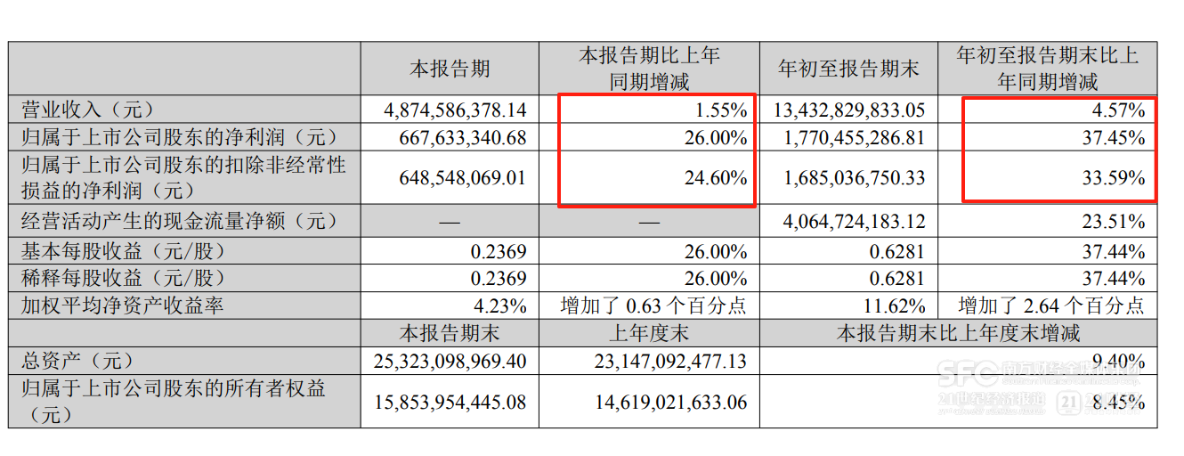 10月20日傍晚燕京啤酒披露三季报:今年第三季度营收48.75亿元,同比增长1.55%,保住增长;归母净利润6.68亿元,同比增长26%,净利润继续保持20%以上的高增长。