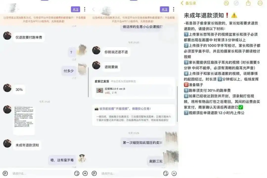 10月20日,千岛通过微博官方对一起“要求退款要扇孩子耳光5分钟”的纠纷回应称,网友发布截图中出现的所谓的“未成年退款须知”为卖家个人发送,并非平台官方规则。