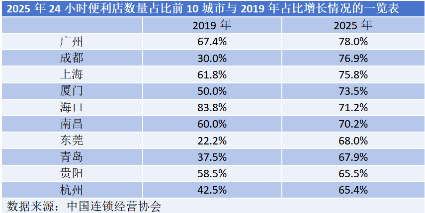 为此,将中国连锁经营协会于2019年和2025年发布的两份数据进行对比,可看出不同城市在一系列政策的指引下,城市24小时便利店的发展情况。