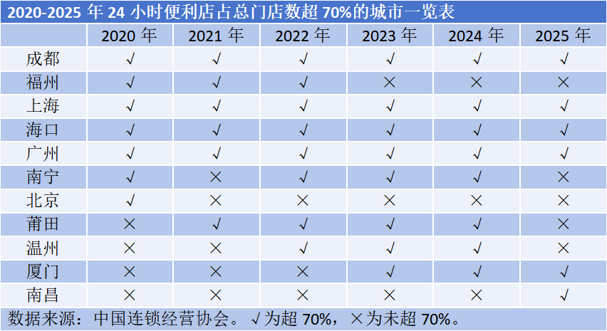 通过对中国连锁经营协会发布的6份数据(2020年-2025年)进行梳理,共有11座城市的24小时便利店梳理占比超过70%。这些分别是广州、上海、成都、福州、海口、南宁、北京、莆田、温州、厦门和南昌。但仅有4座城市连续6个统计年度的24小时便利店占比都超过了70%,分别是广州、上海、成都、海口。