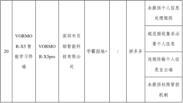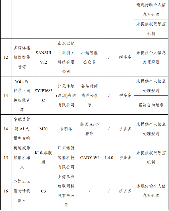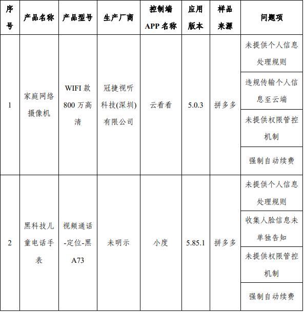其中,“未提供个人信息处理规则” 成为最突出的共性问题,涉及 “家用网络摄像机”“ 星火小飞侠 AI 智能音响” 等 17 款产品,占比达 85%;12款产品均涉及“未提供权限管控机制”问题,占比达60%。