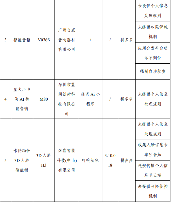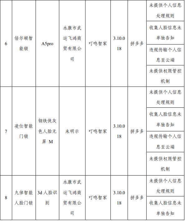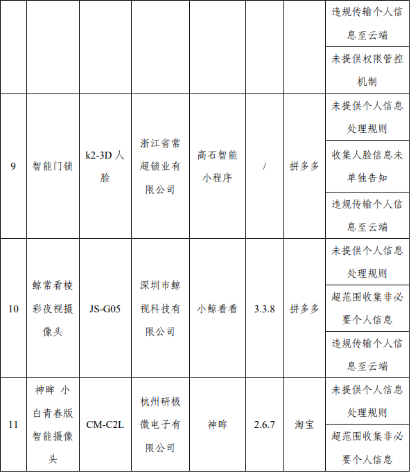 而与用户个人生活空间密切关联的智能门锁与摄像头更涉及 “多维度违规”。披露名单中的9款相关产品均同时存在 “收集人脸信息未单独告知”“违规传输个人信息至云端”“未提供权限管控机制”问题,信息安全面临收集到云端传输的全链条失守。