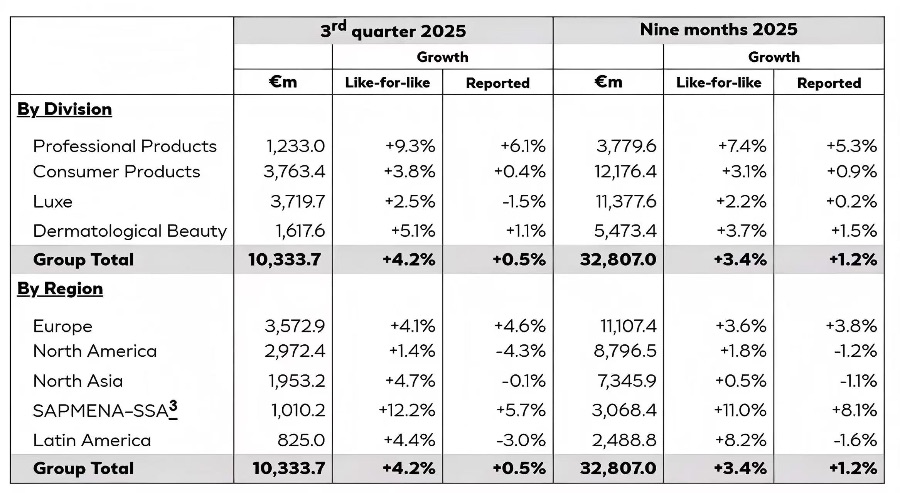 这不仅是简单的规模扩张,更是在行业转型期的卡位之举。10月22日,欧莱雅披露了公司前三季度的业绩,其销售额达到328.07亿欧元,按可比口径和相同汇率增长3.4%,调整后增长3.7%。随着北美和中国大陆市场持续复苏,欧莱雅各事业部和区域也均实现增长。财报指出,北亚地区在陷入连续两年的增长停滞之后,首次实现可比增长转正,前九个月增长0.5%。