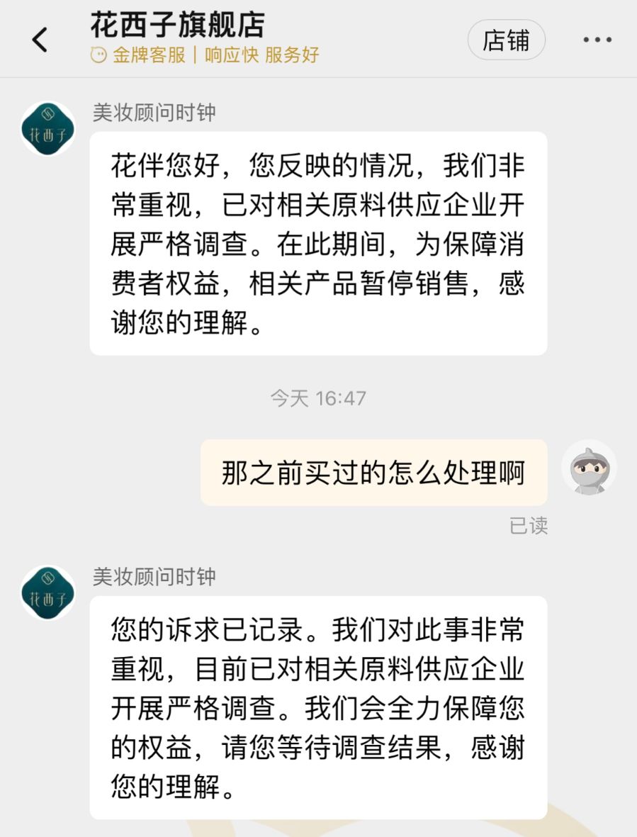 花西子品牌旗舰店客服回复记者称:“已对相关原料供应企业开展严格调查。在此期间,为保障消费者权益,相关产品暂停销售”。