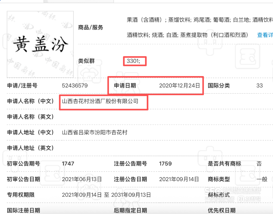在此之前,2019年,曾有一家名为山西兰桂坊酒业有限公司尝试申请注册“黄盖汾”商标,被驳回。