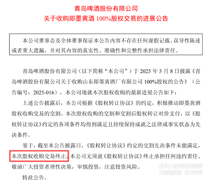 10月26日傍晚,青岛啤酒披露,截至公告披露日,此前收购山东即墨黄酒《股权转让协议》约定的交割先决条件未能满足,本次股权收购交易终止。