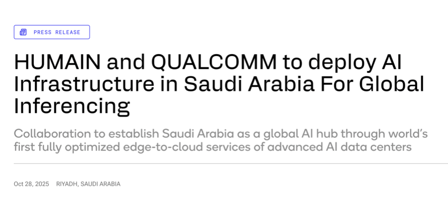 在本次发布两款AI芯片和相关解决方案时,高通同时官宣,与HUMAIN(沙特阿拉伯一家国家级AI公司)开展合作,在沙特阿拉伯部署先进的人工智能基础设施。该计划旨在为全球提供AI推理服务,并打造全球首个全面优化的边缘到云端混合人工智能。