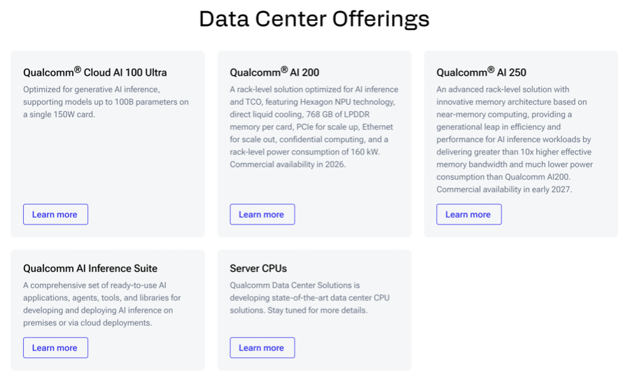 目前,在高通公司官网的“数据中心产品/服务”栏目中,已经有包括Qualcomm Cloud AI 100 Ultra、Qualcomm AI 200、Qualcomm AI 250和高通人工智能推理套件、服务器CPU五大产品矩阵。