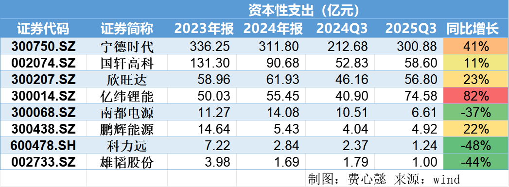 21世纪经济报道记者统计了8家上市锂电企业的资本性支出情况。
