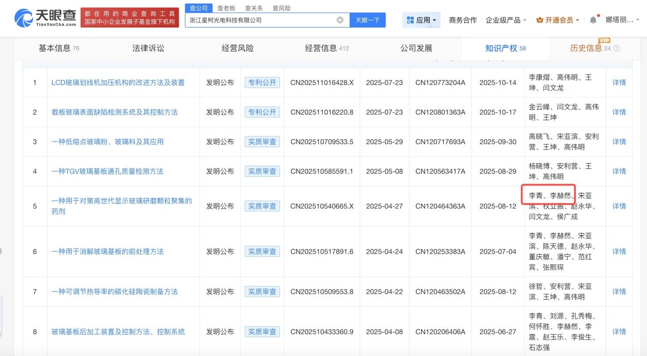 此外,天眼查显示,星柯光电拥有的2024年之前的专利主要为授权类专利,以《玻璃基板生产通道的高温保护方法》(授权公告号:CN116495978B)为例,专利申请(专利权)人为河北光兴半导体技术有限公司和星柯光电。