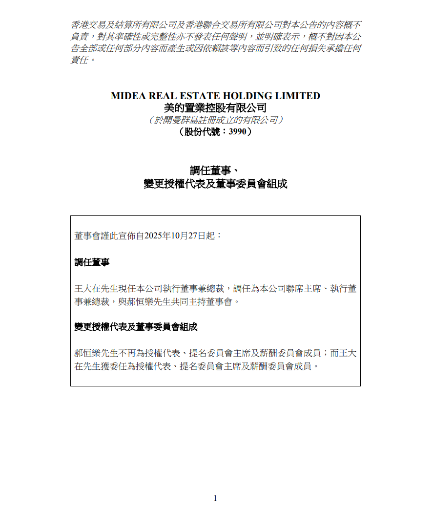 根据企业管治守则相关规定,主席与行政总裁的角色应有区分,不应由一人兼任。美的置业表示,由于王大在自2025年10月27日起同时担任本公司联席主席兼总裁,有所偏离企业管治守则相关规定,但鉴于王大在业务营运方面拥有丰富的经验,董事会认为这种安排有利于执行战略目标及加快推动经营发展。
