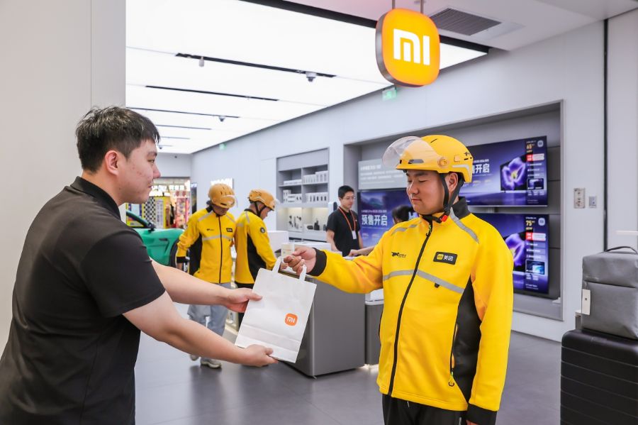 图:美团骑手在3C品牌门店取货。摄影:亦可