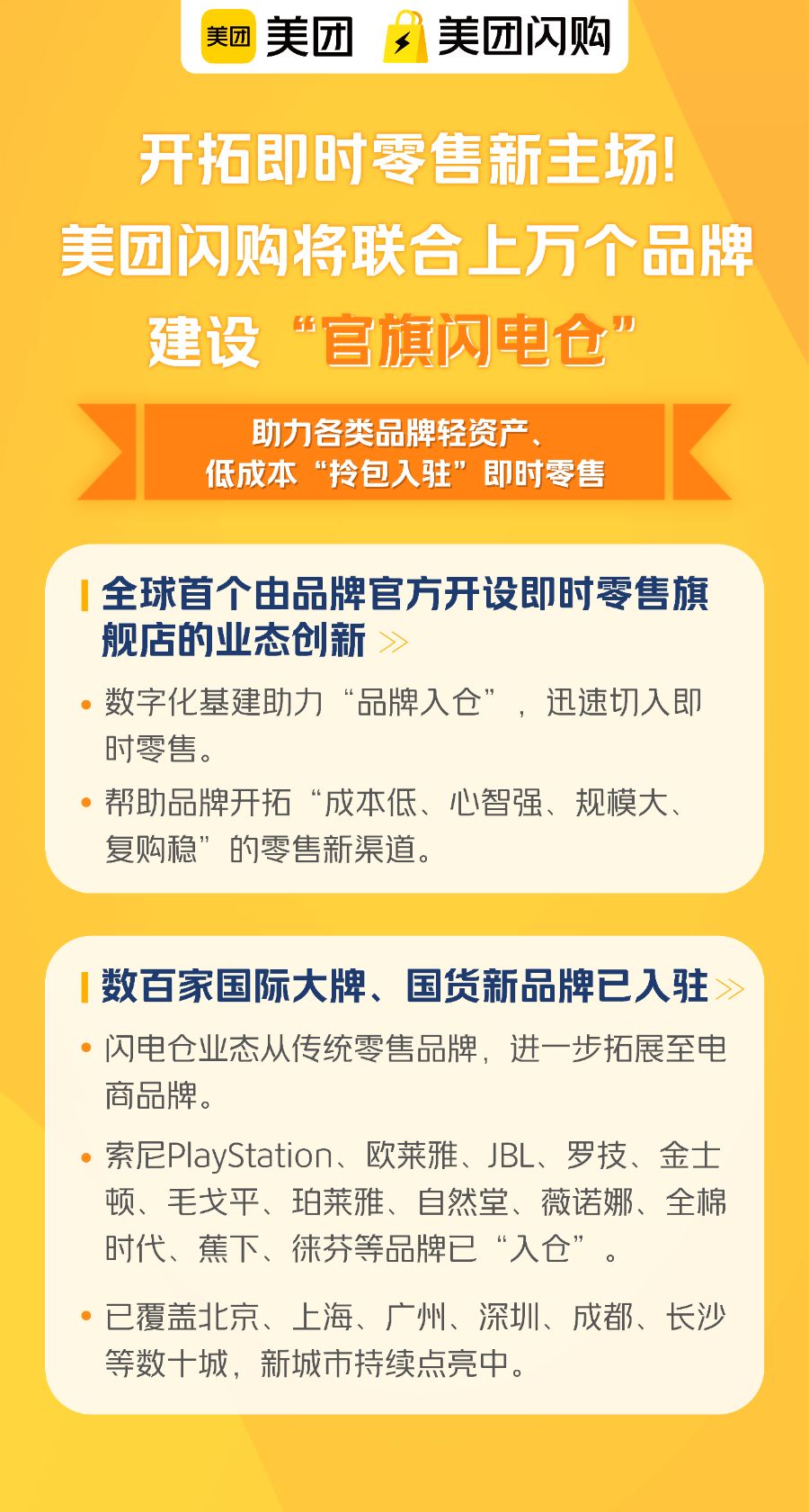 据美团方面人士透露,在闪电仓业态快速增长的同时,美团闪购接到了大量品牌合作的需求,在和品牌共同试点之后,决定帮助品牌入仓,迅速切入即时零售。美团闪购负责帮助品牌搭建整套闪电仓经营的数字化基建,品牌方掌握运营方面的完整自主权。借助“官旗闪电仓”,品牌可用最低成本完成销售,为消费者提供“24小时营业,30分钟商品到手”的购物新体验。