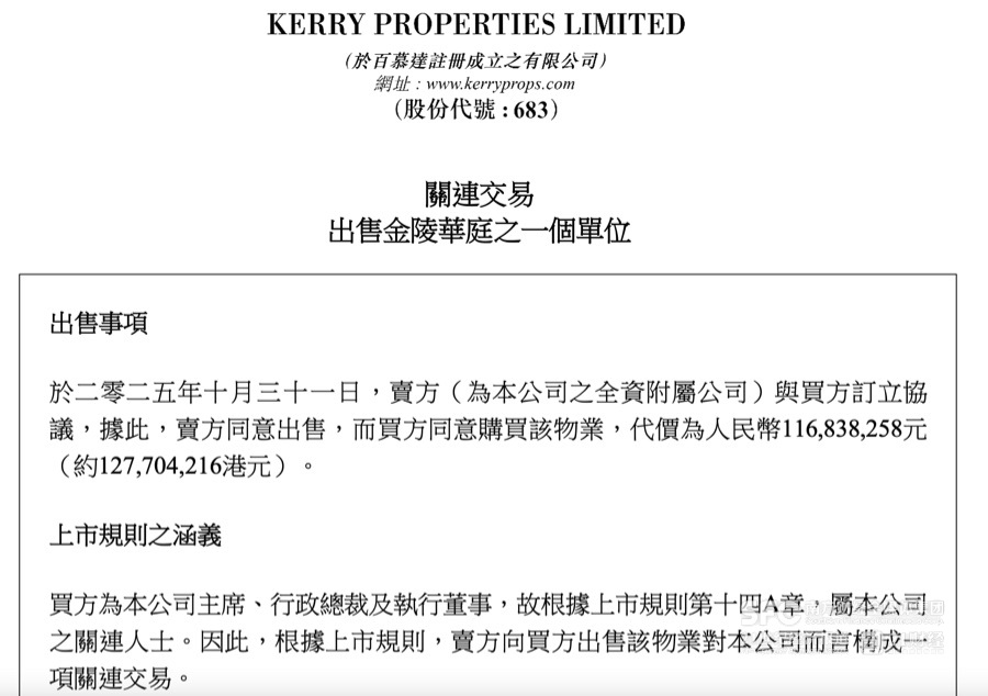 10月31日,嘉里建设(00683.HK)发布关联交易公告称,公司主席、行政总裁及执行董事郭孔华(嘉里建设创始人之子),以人民币1.17亿元(约1.277亿港元)向公司全资附属公司上海卓妙置业购置上海金陵华庭项目第二座一套四房单位。该房源建筑面积约449平方米,尚处于建设阶段,交易完成后集团预计录得约2300万元收益,所得款项将用于集团一般营运资金。