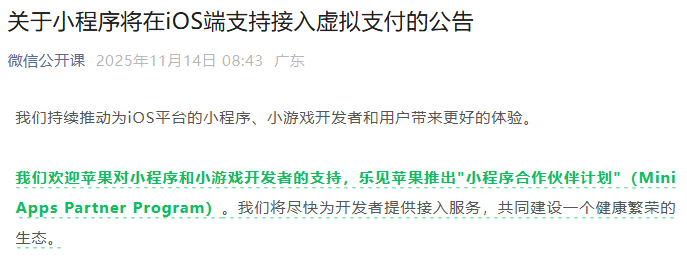 11月14日,微信官方发布关于小程序将在 iOS 端支持接入虚拟支付的公告,表示将尽快为开发者提供接入服务,共同建设一个健康繁荣的生态。有开发者推测,相关的抽成细则应该也会在近期公布。