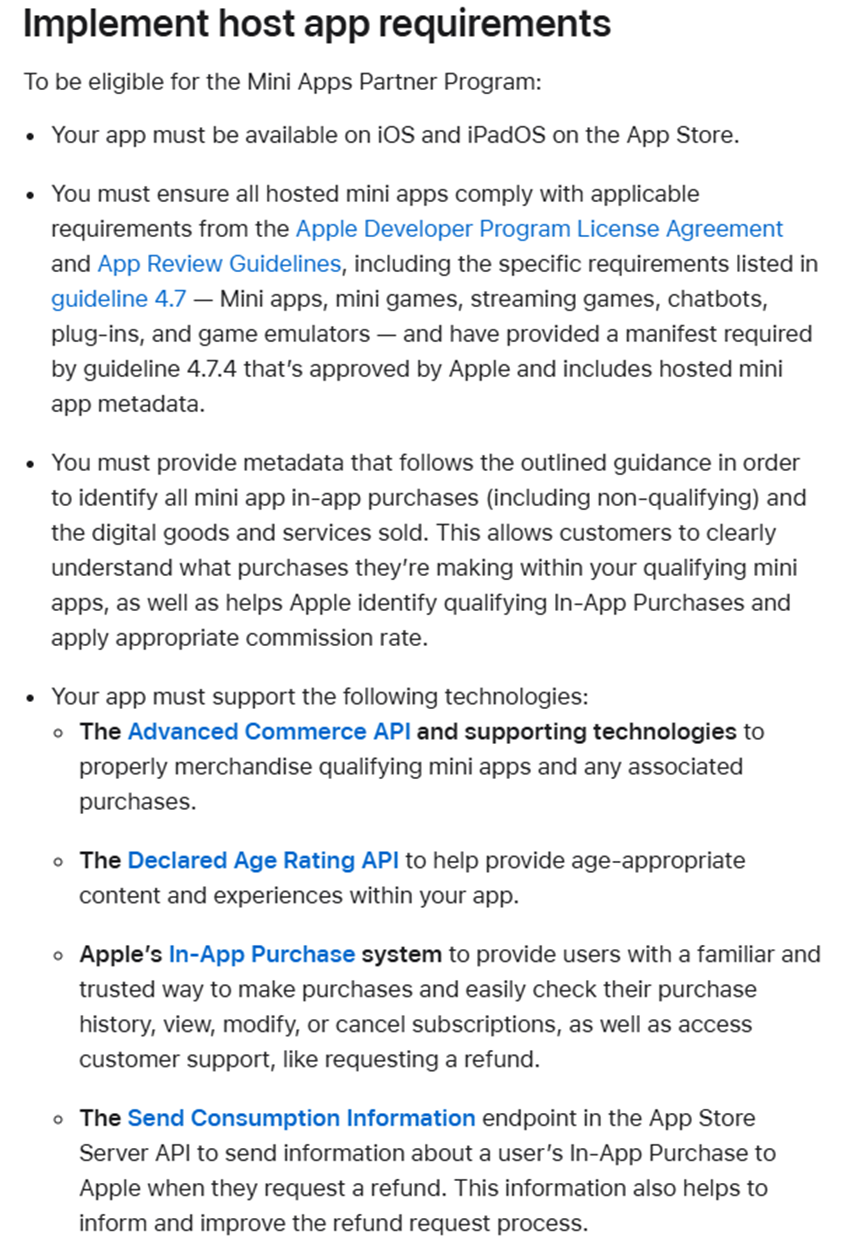 值得注意的是,在苹果发布的“小程序合作伙伴计划”中,除了给出15%的抽成比例外,还明确开发者如果要享受这一比例,必须在应用开发过程中深度集成苹果官方提供的软件技术。例如,使用苹果系统记录用户购买历史、验证用户年龄,以及通过苹果官方渠道处理应用内支付。