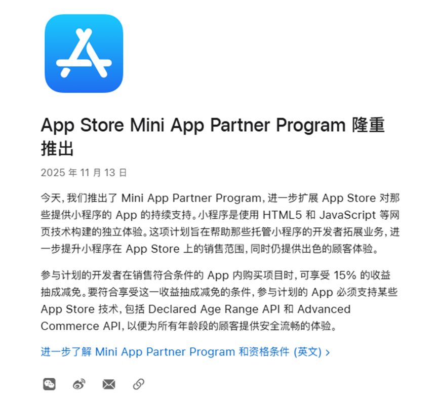 当地时间11月13日,苹果公司宣布针对部分应用开发者,将App Store抽成比例从30%下调至15%,但前提是开发者必须加入苹果推出的全新“小程序合作伙伴计划”(Mini Apps Partner Program)。该新政被视为苹果为将收入来源拓展至微信、支付宝、抖音等代理/聚合类小程序平台,与后者实现利益平衡的解决方案。