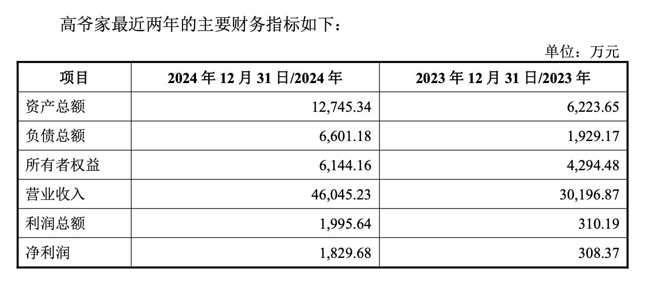从业绩表现看,高爷家在2023年-2024年分别实现营收3.02亿元、4.60亿元,净利润则从308.37万元增长至1829.68万元,也就是说公司两年累计净利润约0.21亿元。