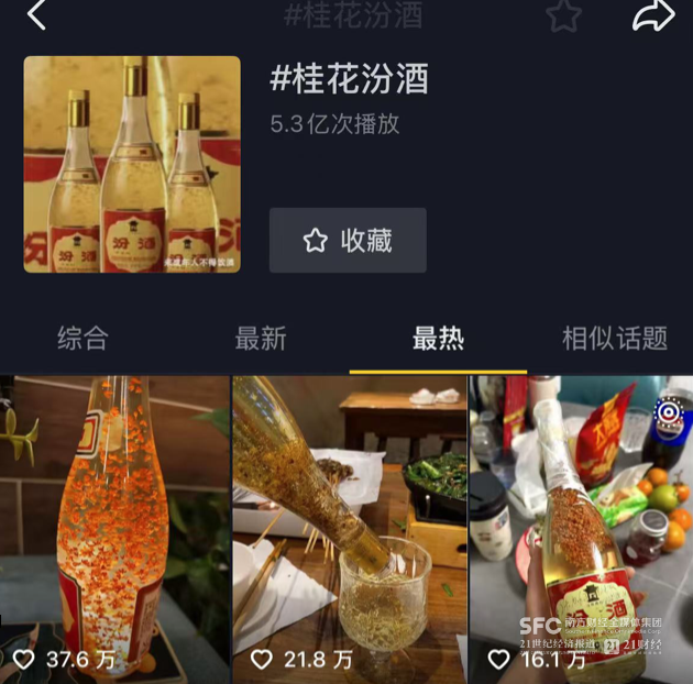 随后汾酒官方紧跟下场,发起了“买玻汾送桂花”活动,并与平台合作发起了“征集桂花汾酒调法”等话题挑战,接住了这一天降流量。21世纪经济报道记者查询注意到,过去一年来,#桂花汾酒话题在抖音平台已有5.3亿次播放。