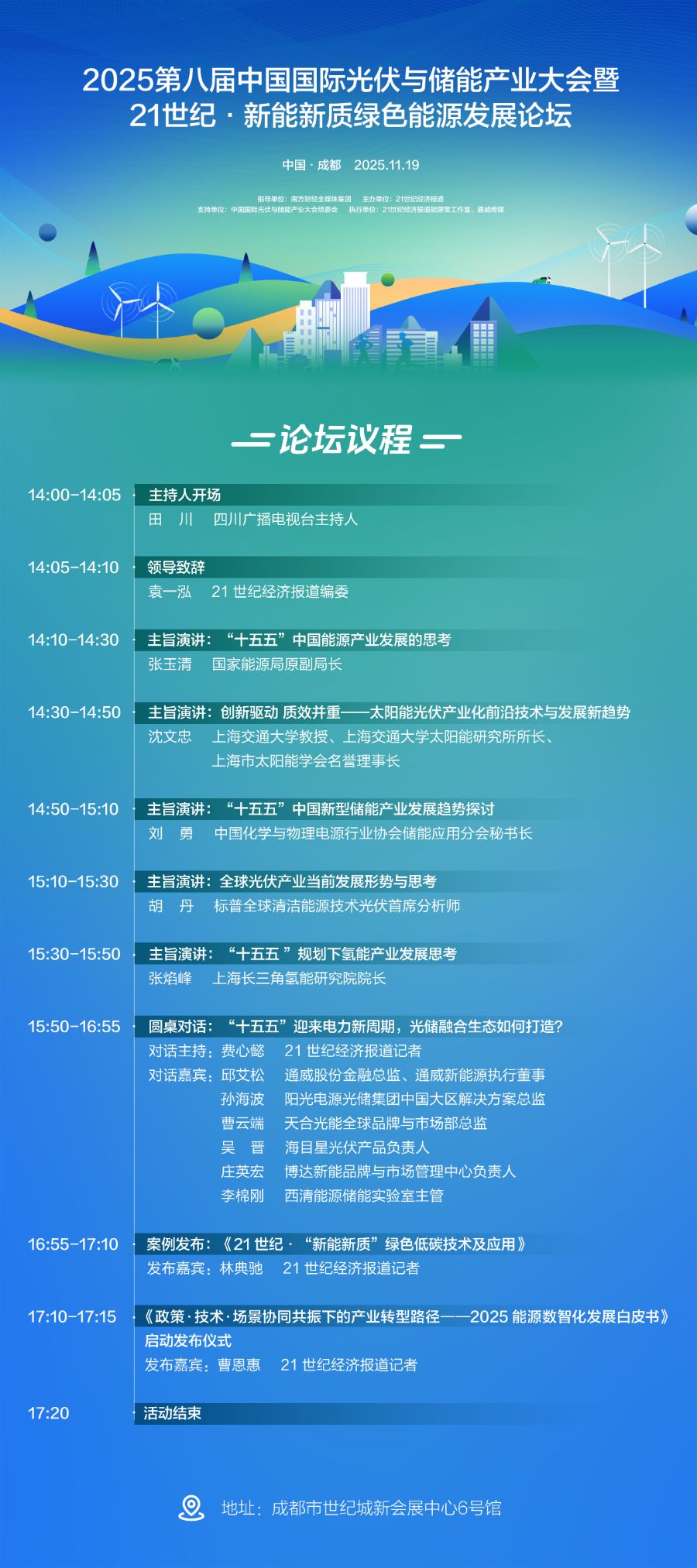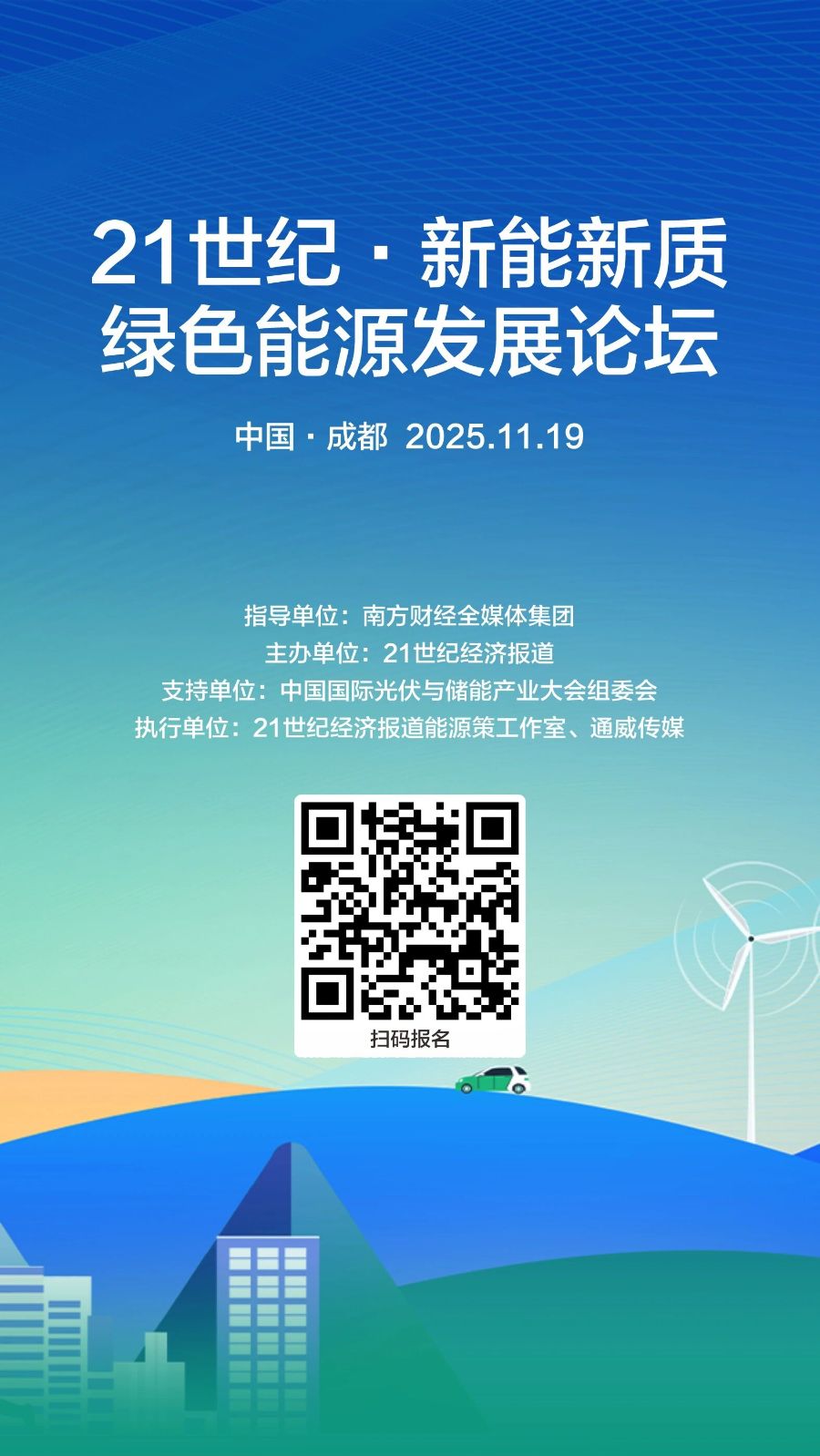 为进一步展示光储行业创新成果,促进光储行业国际交流合作,由南方财经全媒体集团指导、21世纪经济报道主办、中国国际光伏与储能产业大会组委会支持的2025第八届中国国际光伏与储能产业大会暨21世纪·新能新质绿色能源发展论坛即将于11月19日下午在四川成都启幕。