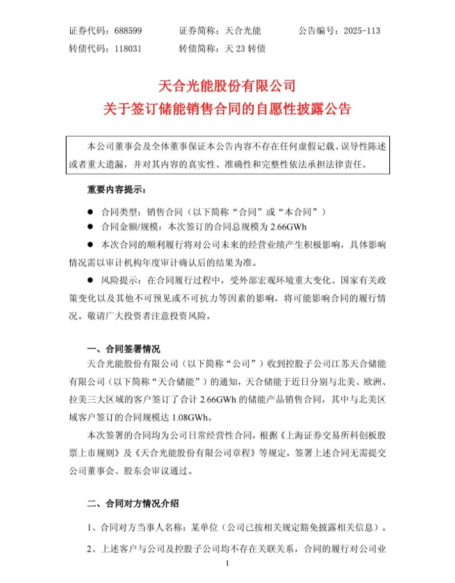 11月17日晚,天合光能自愿披露了其接连获得海外储能大单的消息。
