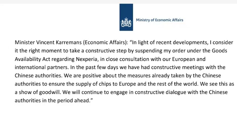 此前19日,荷兰经济事务部长卡雷曼斯在社交媒体宣布,暂缓执行依据荷兰《货物可用性法案》对安世半导体下达的行政令。此举一度被全球媒体解读为荷兰方面向闻泰科技归还安世半导体控制权。