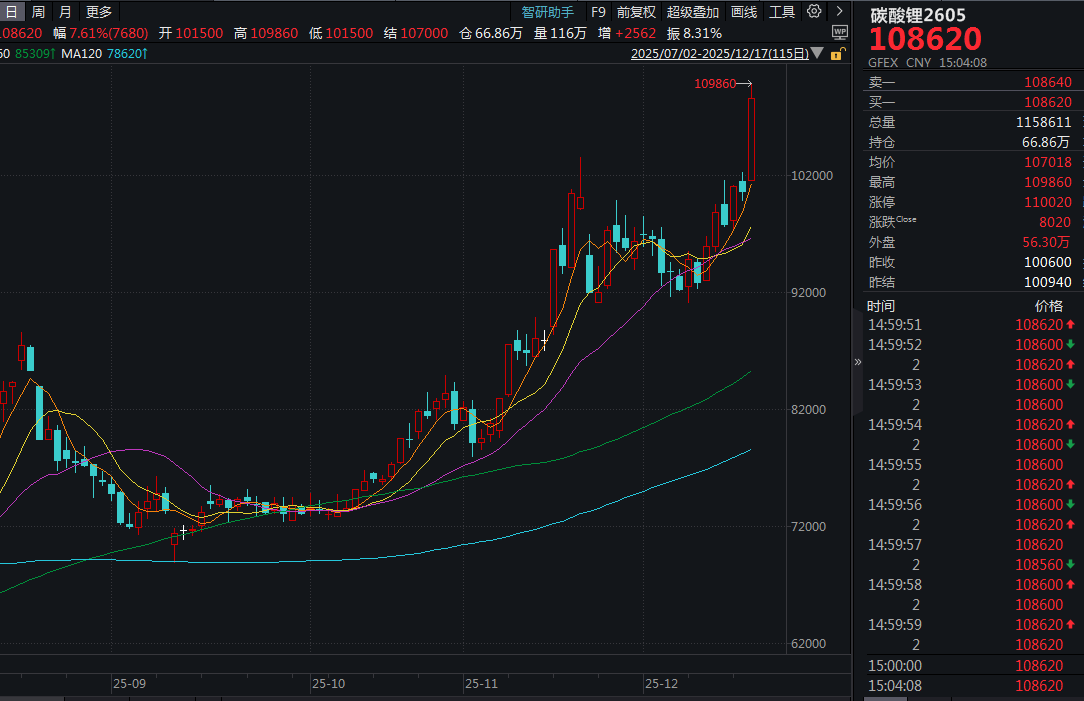 截至12月17日收盘,碳酸锂期货多个合约涨幅超过7%,其中主力合约LC2605等全面突破10万元/吨,远月合约LC2612更是站上11万元/吨。