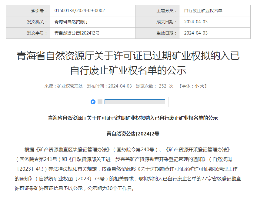 2024年4月,青海省自然资源厅,便曾对许可证已过期矿业权拟纳入已自行废止矿业权名单进行过公示。
