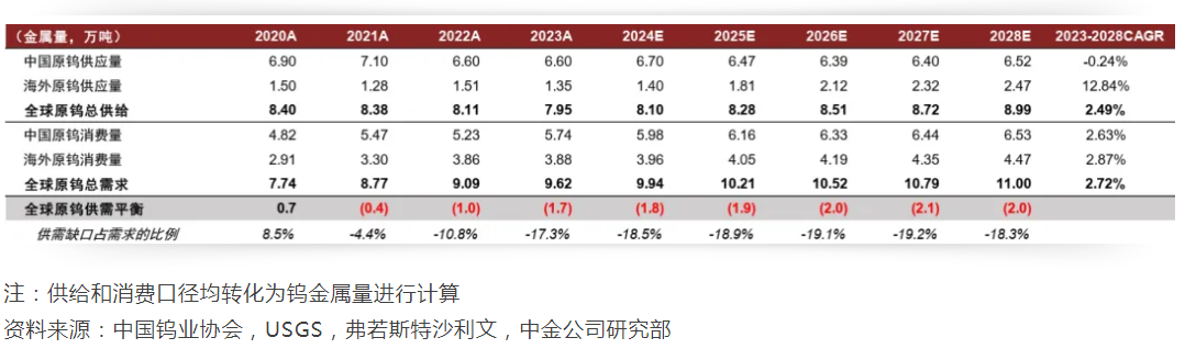 中金公司近期更新的供需平衡表显示,2025年至2028年,全球原钨生产量有望从8.28万吨增加至8.99万吨,同期需求预计由10.21万吨提升至11万吨,供需缺口仍可能会持续。