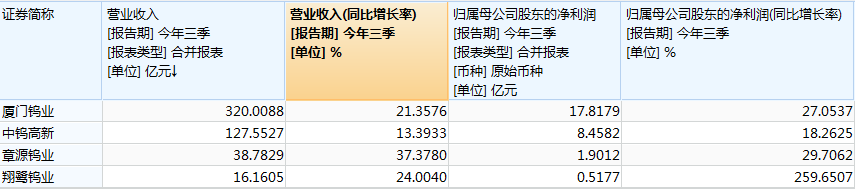 以今年前三季度为例,中钨高新、章源钨业、厦门钨业、翔鹭钨业的营收平均增速不过24%,盈利方面除了翔鹭钨业因为低基数利润增速略高以外,其他三家公司利润增速普遍在30%以下。