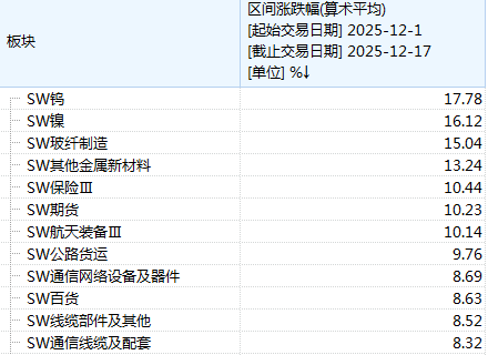 截至12月17日,在申万划分的31个一级行业中,只有有色金属、国防军工等6个行业板块本月取得正收益,同期钨板块的涨幅又是位居所有细分行业首位。