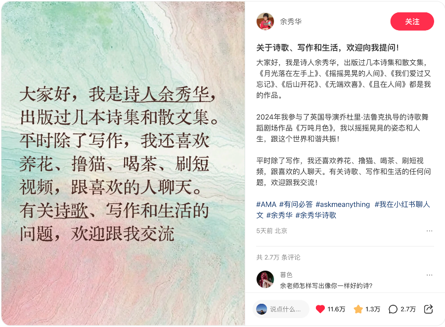 从10月至今,这一波内容正在突破科技圈,引发贝克汉姆、麦家、沈奕斐、庞颖、简明等运动、文学、心理、艺术等多个领域的知名人物下场参与,小红书的评论区开始承载起更多“重”的话题。