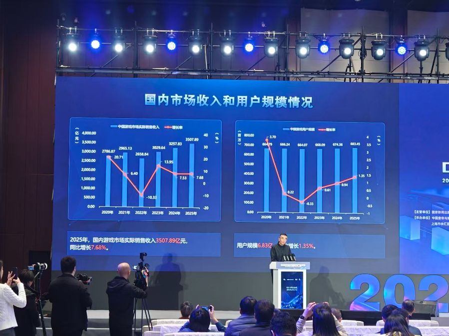 报告内容显示,2025年,国内游戏市场实际销售收入3507.89亿元,同比增长7.68%;用户规模6.83亿人,同比增长1.35%,两项数据均创历史新高。