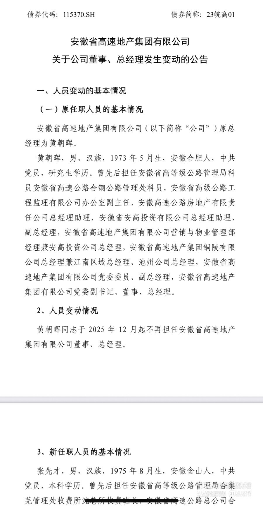 12月22日,安徽省高速地产集团有限公司(简称“安高地产”)发布人事变动公告,宣布黄朝晖自2025年12月起不再担任公司董事、总经理,该职位由张先才接任。