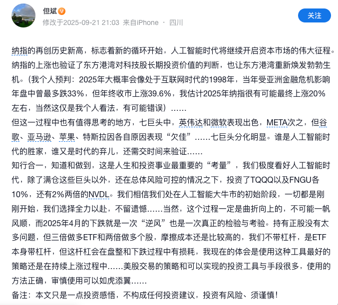 今年9月但斌曾发文预判,“2025年大概率会像处于互联网时代的1998年”,并估计纳指最终可能上涨20%左右。他透露自己“看好人工智能时代”,除了满仓美股科技巨头之外,还配置了ETF工具,选择“全力以赴,不留遗憾”。