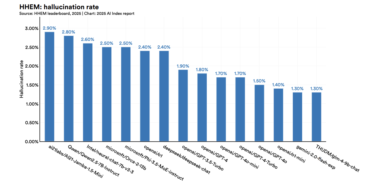休斯评估模型向大模型发出误导性问题,依据大模型生成幻觉的频率来评估。(图/斯坦福大学《2025年AI指数报告》)