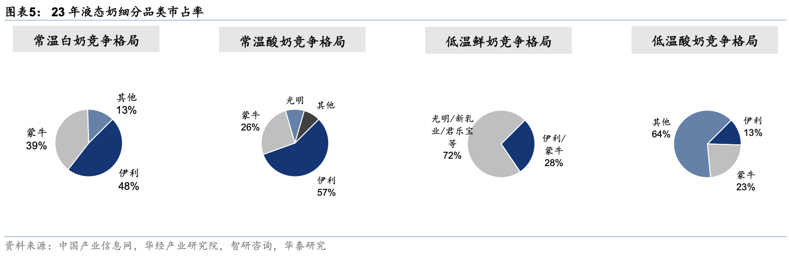 需要注意的是,在常温奶领域,伊利与蒙牛的双寡头格局依旧相对稳定。华泰证券数据显示,在常温白奶中, 2023年CR2合计市占率达87%,其中伊利占比48%,蒙牛占比39%。