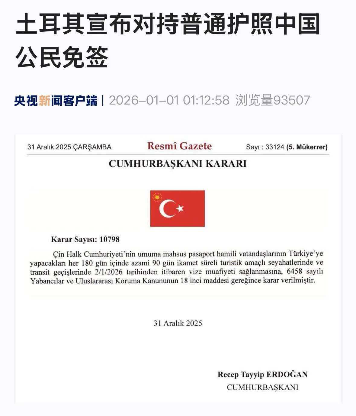 央视新闻报道,当地时间2025年12月31日,土耳其《官方公报》发布总统令,宣布自2026年1月2日起,对持中国普通护照的公民实行免签入境政策。