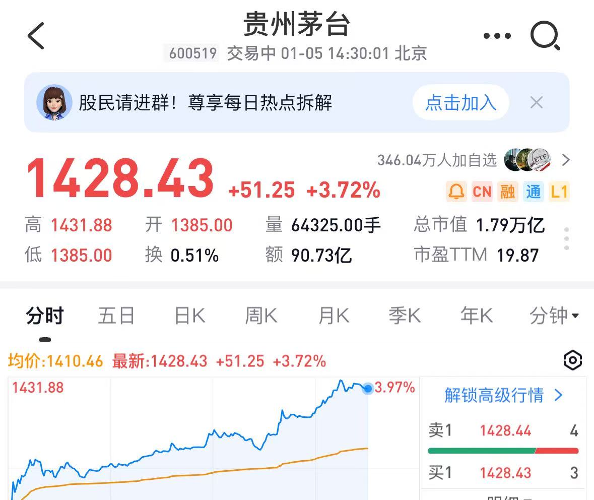 1月5日A股迎来新年第一个交易日,上午开盘后贵州茅台股价持续上涨,14:30左右涨超3.62%,股价最高超过1431元/股。