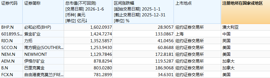 相关数据显示,截至1月6日收盘,全球矿业市值排名靠前的矿业公司分别为必和必拓(1602亿美元)、力拓(1353亿美元)、南方铜业(1254亿美元)、纽蒙特(1130亿美元)。