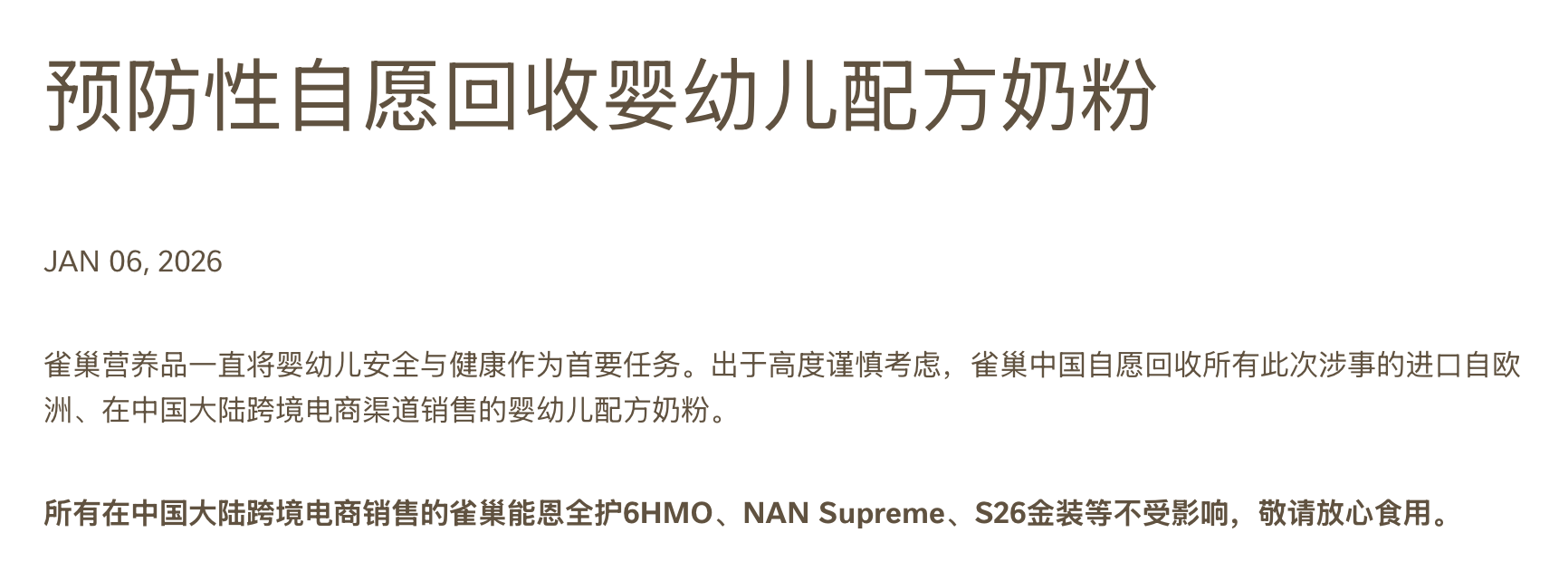1月7日,雀巢中国向21世纪经济报道记者透露,雀巢欧洲部分市场对婴幼儿配方奶粉产品启动了预防性回收措施,雀巢中国对此高度重视,中国市场少数产品可能受到影响。作为预防性举措,雀巢中国已经对部分特定批次的婴幼儿配方奶粉进行了回收。“截至目前,我们尚未收到与相关产品有关的任何不适报告。所有在中国大陆市场注册并销售的雀巢特殊医学用途婴儿配方食品、超启能恩、启赋、S26铂臻等不受影响。”雀巢中国称。