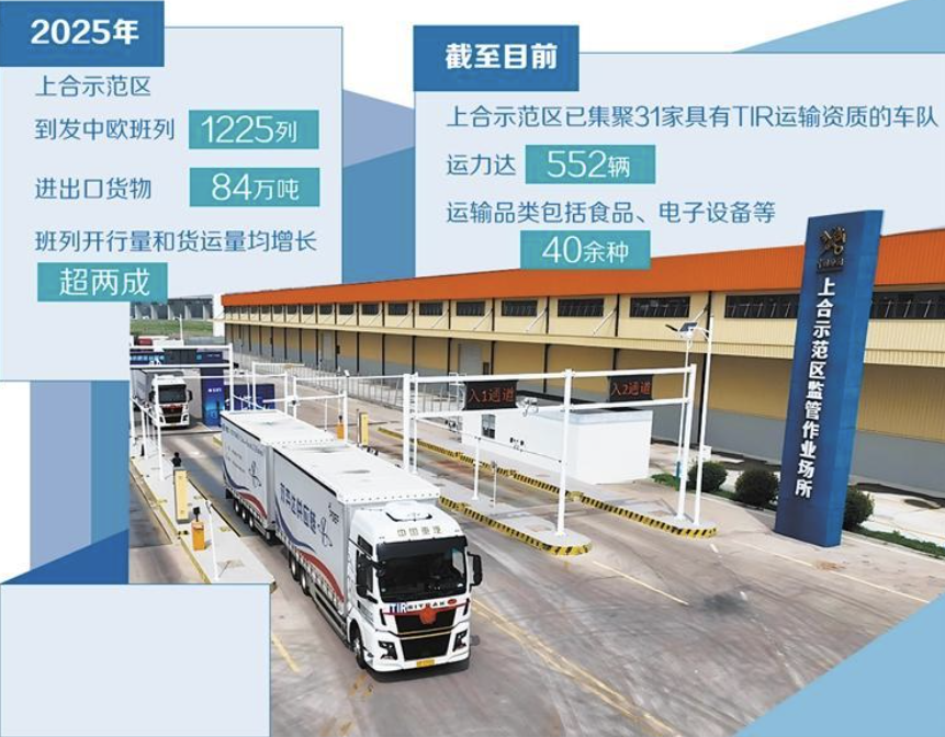 为构建高效跨境物流贸易体系,上合示范区一方面大力扩展到发中欧班列线路和班次,另一方面积极发展TIR(国际道路运输),铁陆联动拓宽“一带一路”物流通道。2025年,上合示范区到发中欧班列1225列,进出口货物84万吨,班列开行量和货运量均增长超两成,创历史同期新高。TIR发运量继续保持全国首位,全年发运435车次,同比增长53.7%。